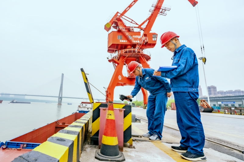 ▲国网安徽安庆供电公司员工对五里庙分港港口岸电设备进行测温检查