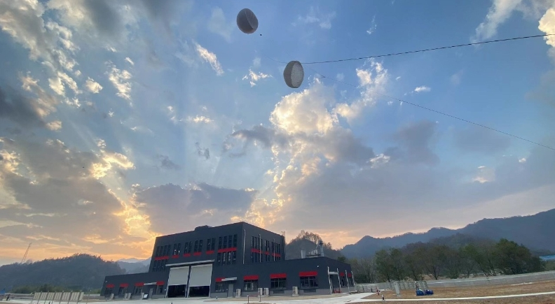 高空风力发电系统由空中组件、牵引缆绳和地面组件三部分构成,此次交付启运的做功伞是空中组件的核心装备,展开面积达5000平方米,相当于12个标准篮球场。
